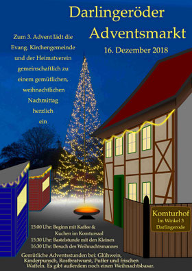 Klein und Groß trafen sich am 3. Adventssonntag 2018 zum 2. Darlingeröder Adventsmarkt auf dem Komturhof. Viele Darlingeröderinnen und Darlingeröder sowie Gäste aus nah und fern nutzten den Nachmittag zu einem Familienausflug oder zum Treffen mit Freunden. Es war eine gute Gelegenheit sich in Ruhe auf das bevorstehende Weihnachtsfest und den Jahreswechsel einzustimmen. Nur ganz selten sah man Mobiltelefone in Betrieb, vielmehr wurde erzählt, gescherzt und herzhaft gelacht.