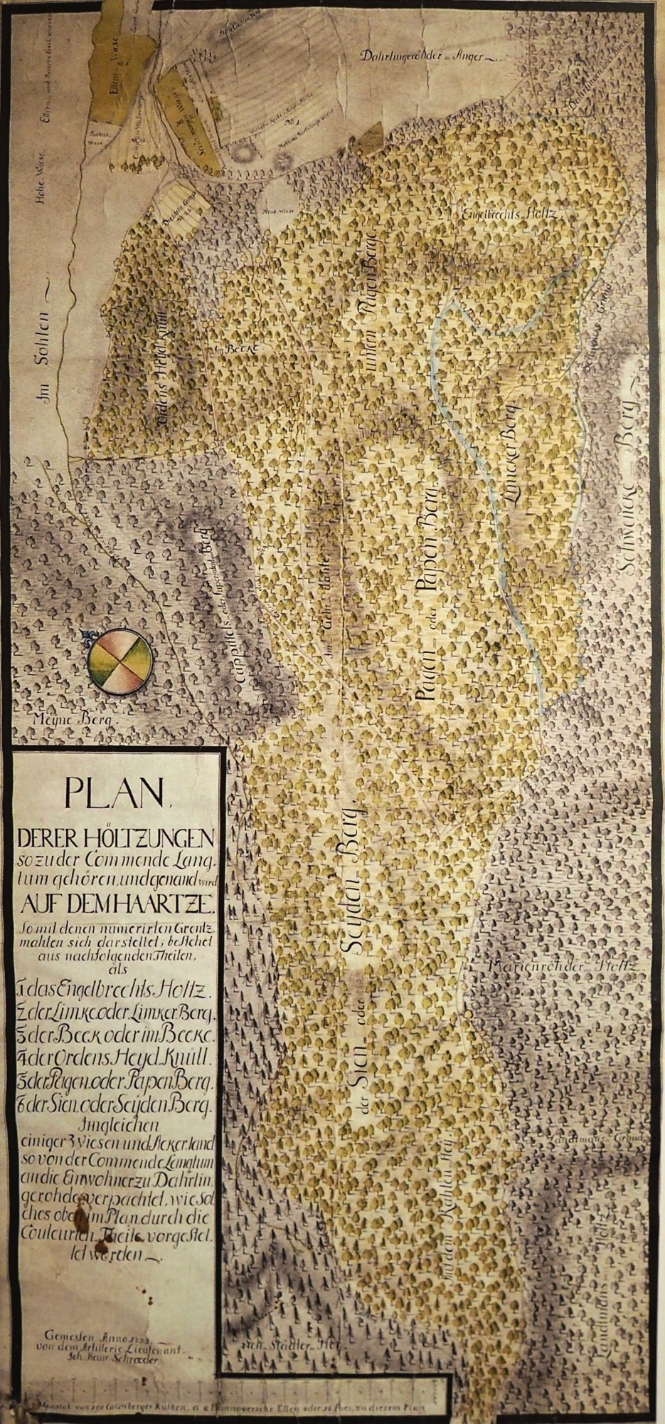 "PLAN DERER HÖLTZUNGEN so zu der Commende Langlum gehören und genand wird AUF DEM HARTZE" (1753)